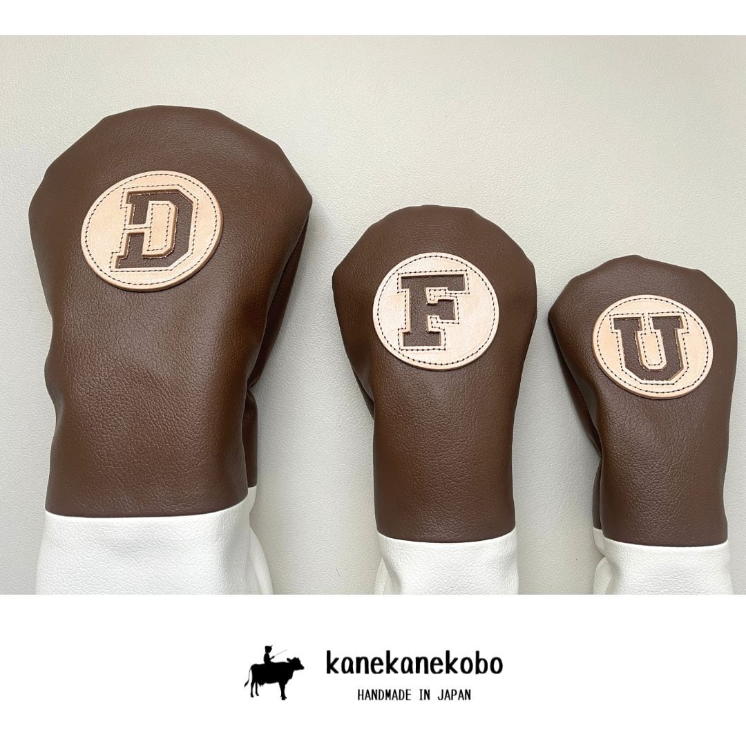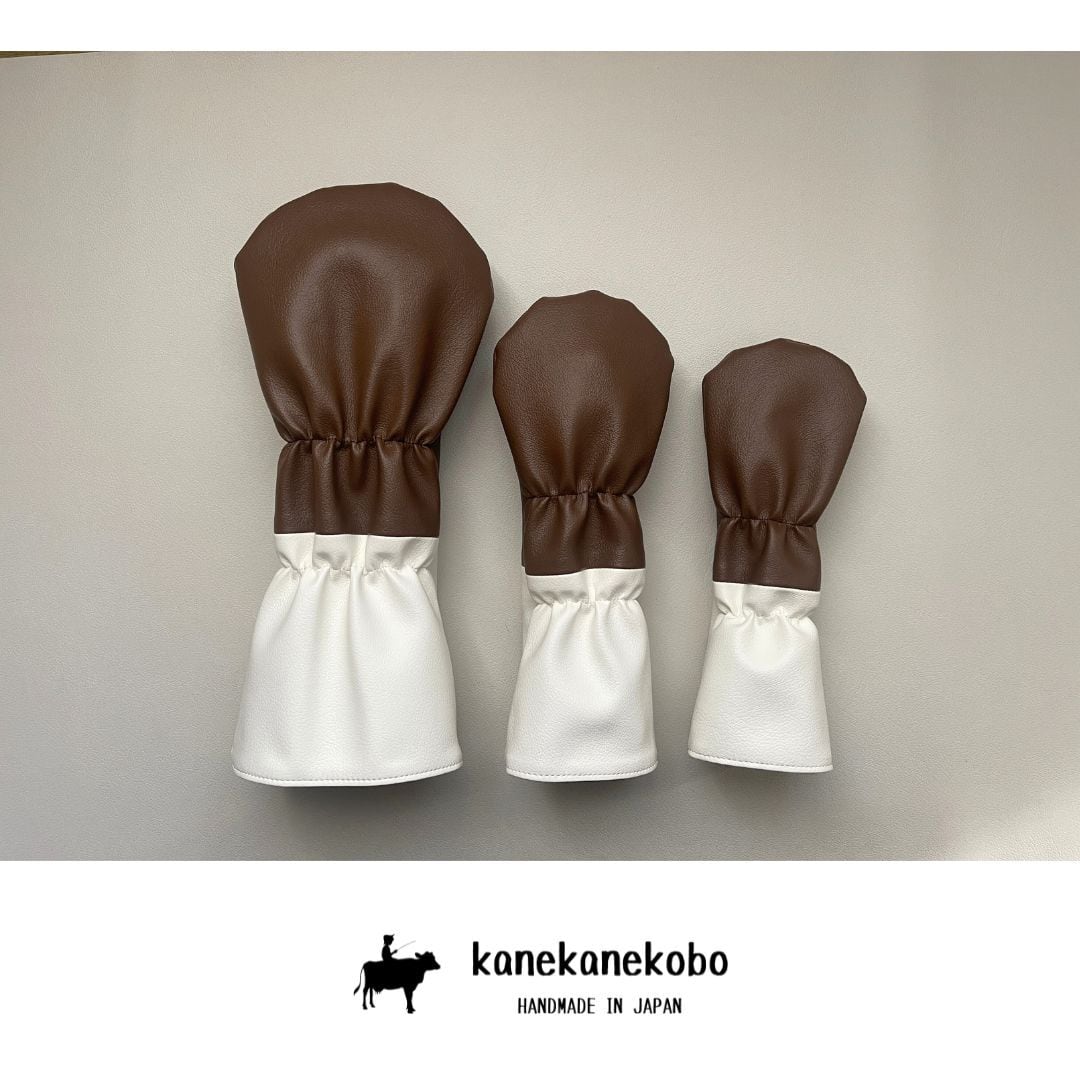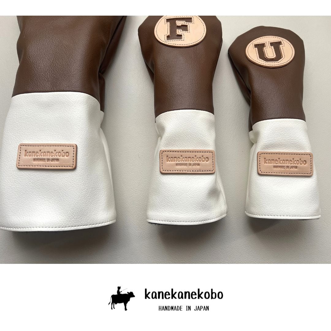 組み合わせ自由【1セット限定販売・名入れオプション無料】ブラウン&ホワイト合成皮革ヘッドカバーセット